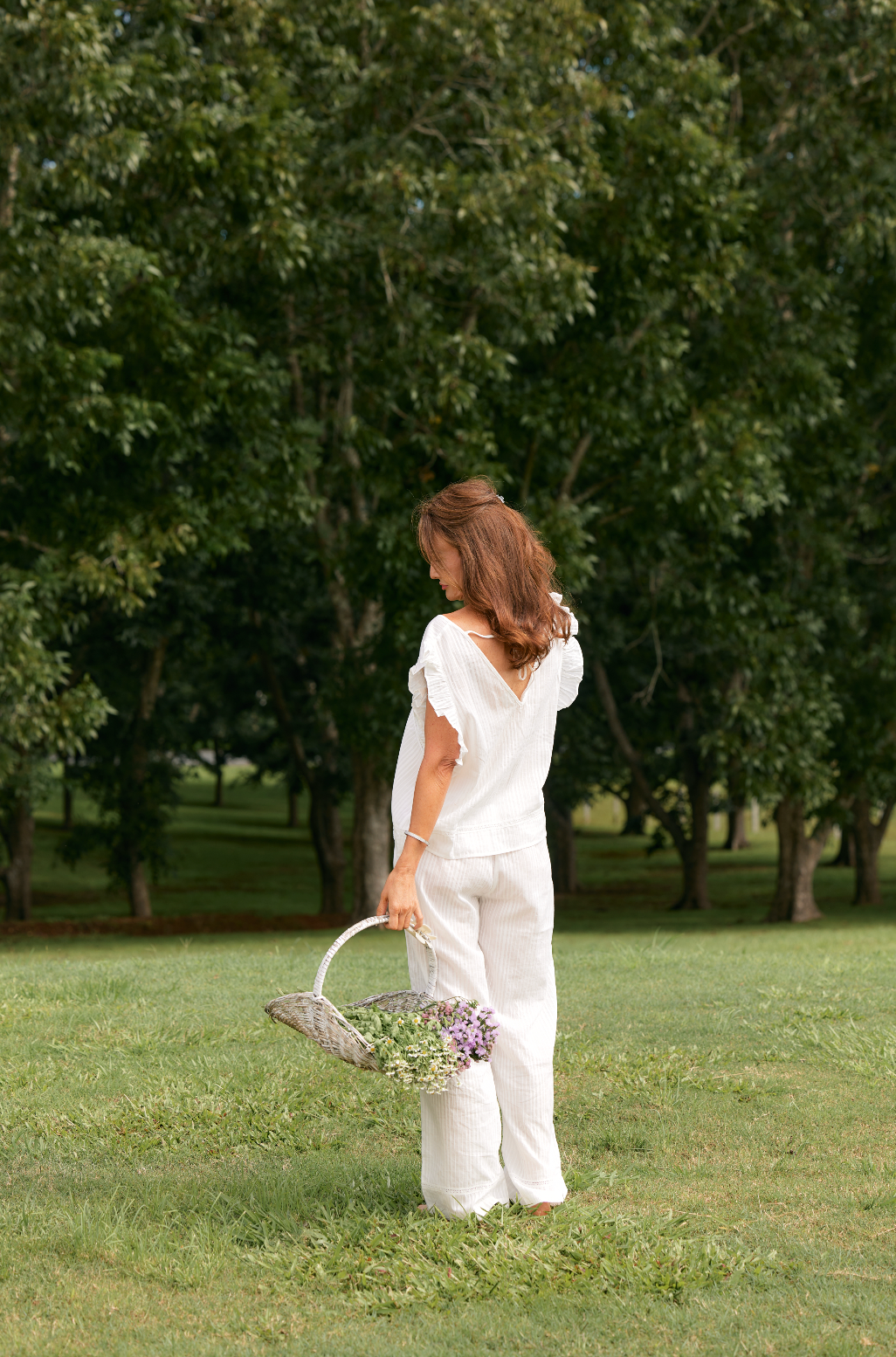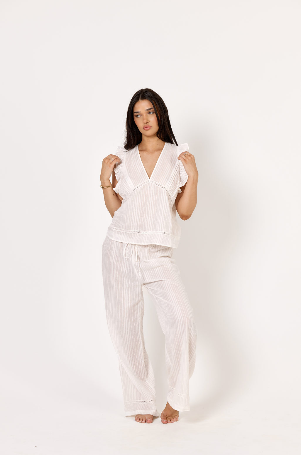 These cotton jacquard pants are the perfect addition to your wardrobe. Paired perfectly with the sheer jacquard frill top, they create an elegant and sophisticated look for brides or bridesmaids alike. Immerse yourself in luxury and style on your special day.